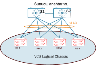 You can define up to 8 vLAG (virtual Link Aggregation Group) switches within the VCS LC structure. In the example below, I drew 4 VDX switches. Switches in VCS work like a single switch. The servers/switches I’ve drawn treat VDX switches as a single chassis switch.