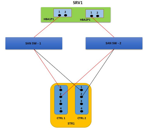 Suppose we have a server and a storage. connect to SAN switches from one port each. Let’s keep the structure a little simple. Briefly, have 2 port Server and 2 port Storage connection.